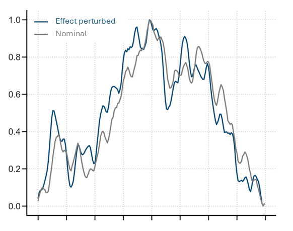 The comparison between nominal (gray) and effect-perturbed (blue) signals shows how morphological changes indicate developing problems: